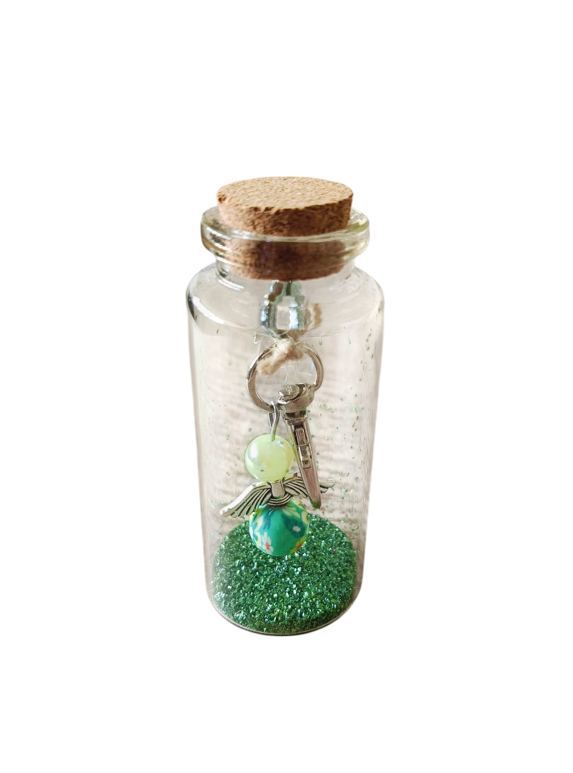 Flesje met kurken dop, groen beschermengeltje en groen zand
