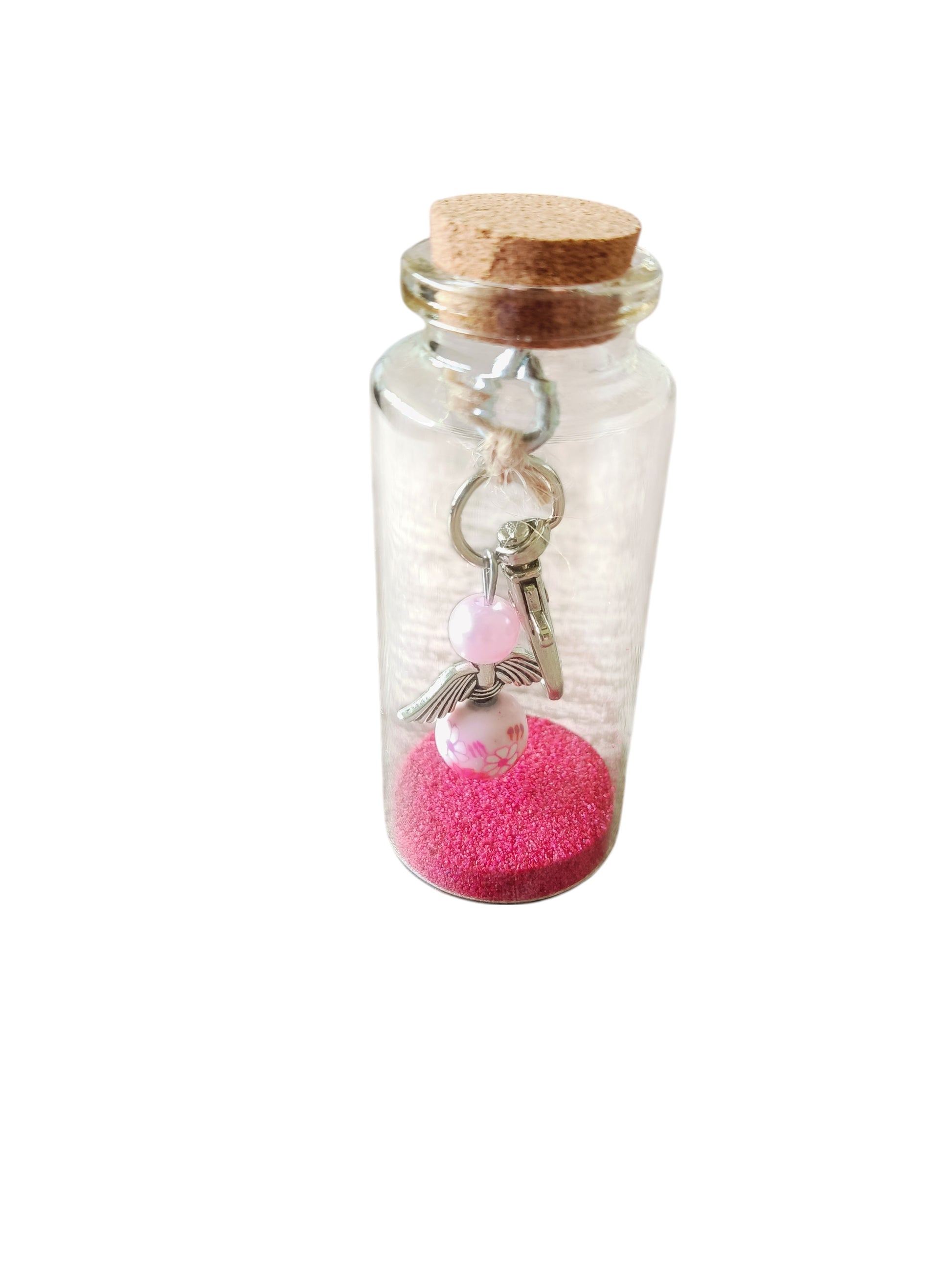 Flesje met kurken dop, roze engeltje (lijfkraal met bloemen) en roze steentjes